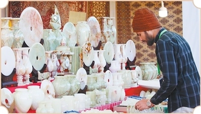 巴基斯坦客商在雅礱物交會布置展臺。
