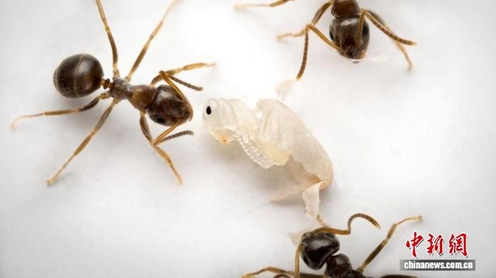 螞蟻檢查幼蟲(chóng)(圖片來(lái)自Christopher D. Pull/奧地利科技學(xué)院)。施普林格·自然 供圖