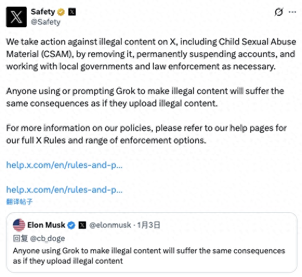X表示,平臺會對非法內(nèi)容采取行動,包括刪除資料、封號,并在必要時與執(zhí)法機構(gòu)展開合作。馬斯克也在周末的一條帖子中強調(diào),任何使用“格羅克”制作非法內(nèi)容的人,將面臨與上傳非法內(nèi)容同樣的法律后果。