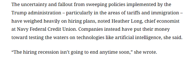 報(bào)道還援引美國海軍聯(lián)邦信用合作社(Navy Federal Credit Union)首席經(jīng)濟(jì)學(xué)家希瑟·朗的觀點(diǎn)稱,特朗普政府推行的一系列政策,尤其是關(guān)稅和移民政策,所帶來的不確定性及后果對(duì)招聘計(jì)劃造成了沉重影響。希瑟·朗認(rèn)為,招聘市場(chǎng)的低迷狀況短期內(nèi)不會(huì)結(jié)束。