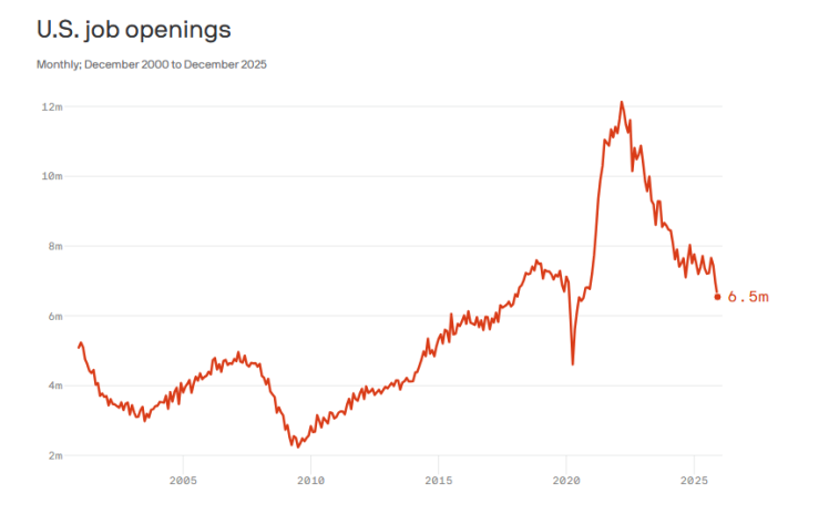 美國《國會(huì)山報(bào)》援引美國勞工統(tǒng)計(jì)局的數(shù)據(jù)報(bào)道稱,美國2025年12月份的職位空缺數(shù)量為650萬個(gè),呈下降趨勢(shì),較上年同期減少了96.6萬個(gè)。