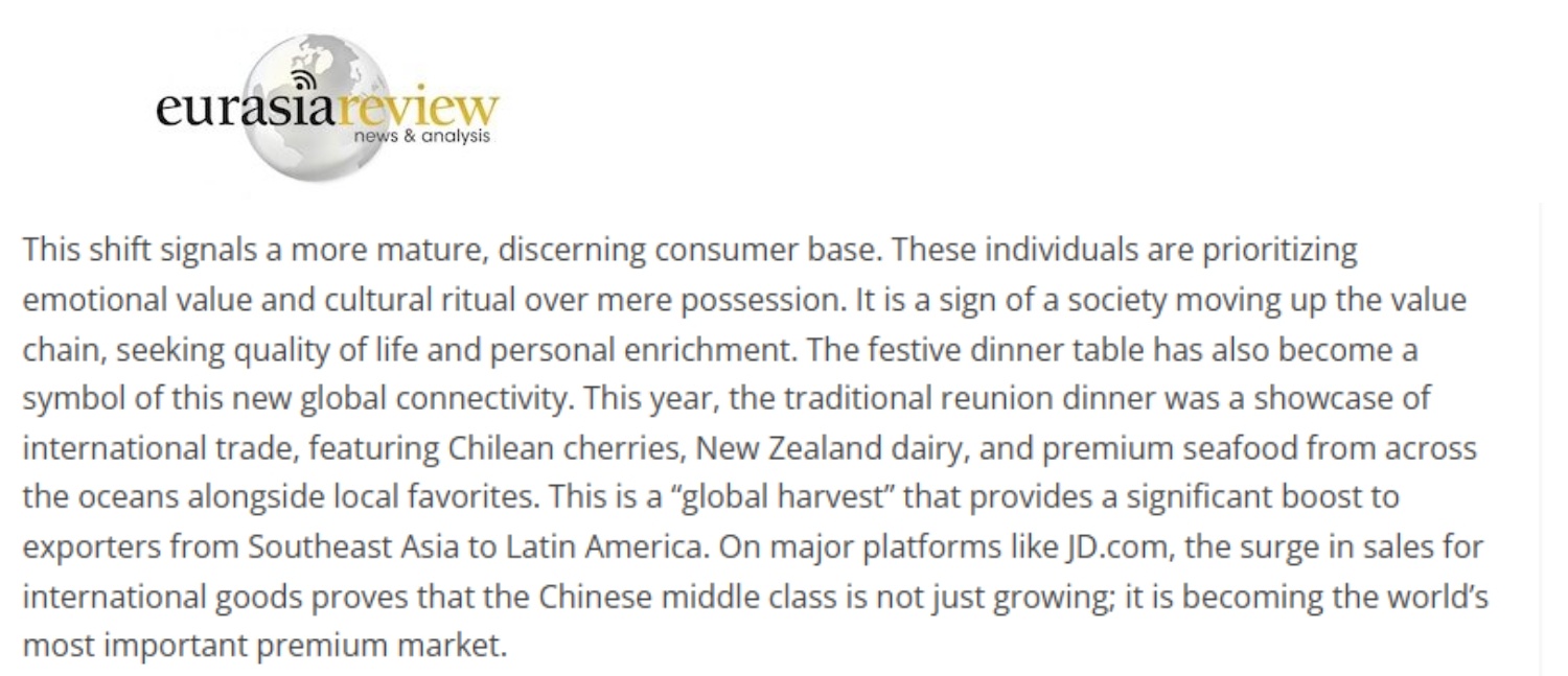 文章稱,這種轉變標志著中國消費者變得更加成熟、更具品位。他們更注重情緒價值和文化儀式感,而不僅僅是物質追求。這象征著社會正朝著價值鏈上游邁進,追求生活品質和個人提升。節(jié)日的餐桌也已成為這種新型全球互聯(lián)的象征。今年,傳統(tǒng)年夜飯成為國際貿易的展示窗口:既有智利車厘子、新西蘭乳制品和來自大洋彼岸的優(yōu)質海鮮,也有本地美食。這是一場“全球豐收”,為從東南亞到拉丁美洲的商品出口提供了強大動力。在跨境電商平臺上,國際商品的銷售激增證明了中國正在成為全球最重要的高端消費市場。