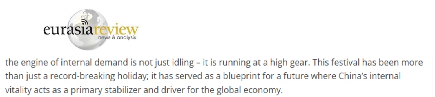 文章最后說,春節(jié)消費熱潮表明,內需引擎非但沒有空轉,反而在高速運轉。這個春節(jié)的意義不僅僅在于其破紀錄的假期數(shù)據(jù),而是在于它繪制了一幅未來藍圖:中國的內在活力將成為全球經濟的主要穩(wěn)定器和驅動力。