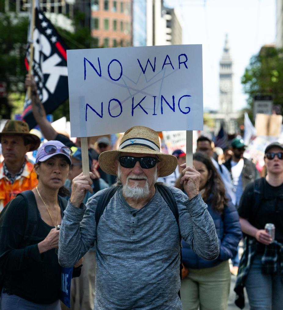 3月28日,人們在美國加利福尼亞州舊金山參加“不要國王”抗議活動。新華社發(fā)(朱子于攝)