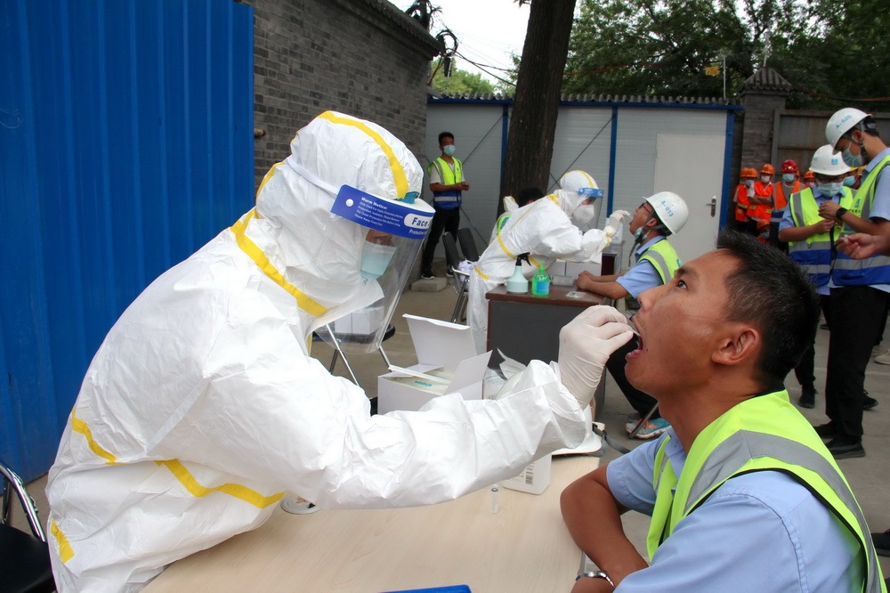 6月15日至17日,中建三局北京公司在京1042名職工做完核酸檢測(cè),同時(shí)公司邀請(qǐng)專(zhuān)業(yè)機(jī)構(gòu)為在建項(xiàng)目的上萬(wàn)名勞務(wù)工人、安保及物業(yè)管理人員提供上門(mén)核酸檢測(cè)。新華社發(fā)(柯玉乾攝)