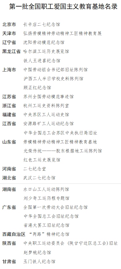 第一批全國(guó)職工愛(ài)國(guó)主義教育基地包括北京市長(zhǎng)辛店二七紀(jì)念館、黑龍江省鐵人王進(jìn)喜紀(jì)念館、上海市中國(guó)勞動(dòng)組合書(shū)記部舊址陳列館、廣東省全國(guó)第一次勞動(dòng)大會(huì)舊址紀(jì)念館、陜西省中央職工運(yùn)動(dòng)委員會(huì)(陜甘寧邊區(qū)總工會(huì))舊址等27家單位。旨在進(jìn)一步加強(qiáng)紅色工運(yùn)資源的保護(hù)挖掘和宣傳利用,引領(lǐng)各級(jí)工會(huì)努力把紅色工運(yùn)資源建設(shè)成為開(kāi)展黨史學(xué)習(xí)教育的重要陣地,打造成愛(ài)國(guó)主義教育、革命傳統(tǒng)教育、加強(qiáng)職工思想政治引領(lǐng)的生動(dòng)課堂,團(tuán)結(jié)引導(dǎo)廣大職工群眾更好傳承紅色基因、賡續(xù)紅色血脈、汲取奮進(jìn)力量。第一批全國(guó)職工愛(ài)國(guó)主義教育基地在中國(guó)工運(yùn)史上影響重大,代表性強(qiáng)、知名度高,現(xiàn)有的設(shè)施建設(shè)和保護(hù)利用較好,符合時(shí)代要求,具有較強(qiáng)的示范引領(lǐng)作用。