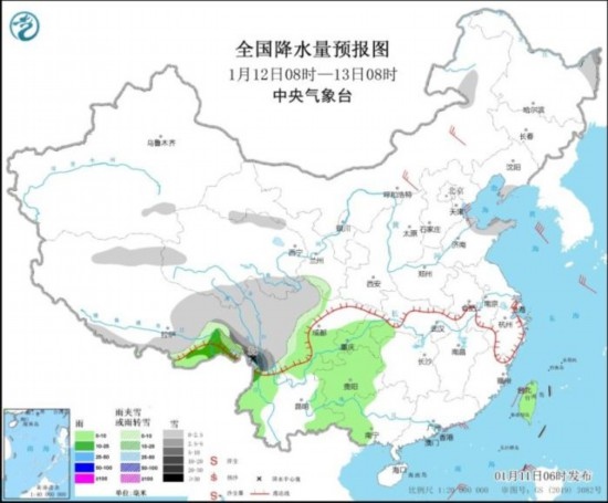 全國降水量預報圖(1月12日8時-13日8時)