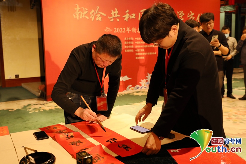 圖為書法家書寫"福"字和春聯(lián)。中國(guó)青年網(wǎng)記者 左橙 攝