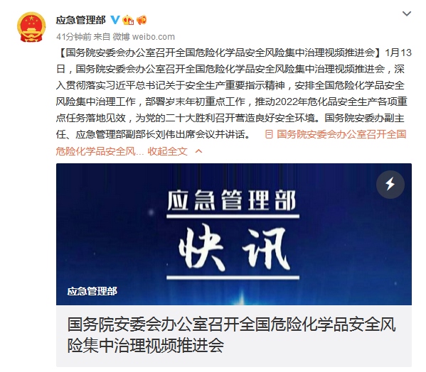 1月13日,國(guó)務(wù)院安委會(huì)辦公室召開全國(guó)危險(xiǎn)化學(xué)品安全風(fēng)險(xiǎn)集中治理視頻推進(jìn)會(huì),安排全國(guó)危險(xiǎn)化學(xué)品安全風(fēng)險(xiǎn)集中治理工作,部署歲末年初重點(diǎn)工作,推動(dòng)2022年危化品安全生產(chǎn)各項(xiàng)重點(diǎn)任務(wù)落地見效,為黨的二十大勝利召開營(yíng)造良好安全環(huán)境。