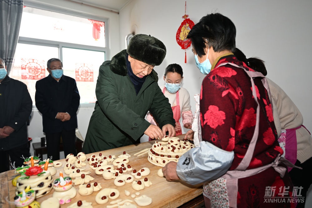 2022年1月26日下午,習近平在臨汾市霍州市師莊鄉(xiāng)馮南垣村,同師紅兵一家做年饃。