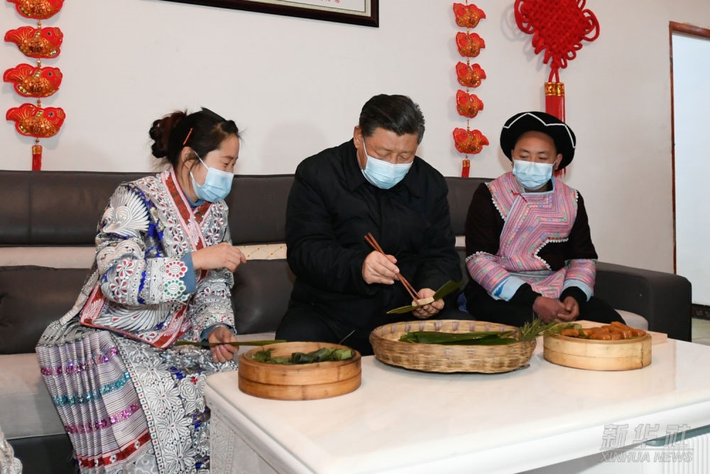 2021年2月3日至5日,習近平來到貴州考察調(diào)研,看望慰問各族干部群眾,向全國各族人民致以美好的新春祝福。這是3日下午,習近平在畢節(jié)市黔西縣新仁苗族鄉(xiāng)化屋村苗族村民趙玉學家,同趙玉學一家邊聊家常邊制作當?shù)貍鹘y(tǒng)節(jié)日食品黃粑。