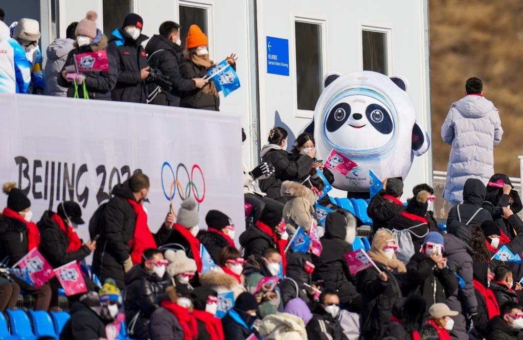 2月6日,2022年北京冬奧會越野滑雪男子雙追逐(15公里傳統(tǒng)技術(shù)+15公里自由技術(shù))比賽,吉祥物“冰墩墩”在現(xiàn)場與觀眾互動。新華社記者劉潺攝