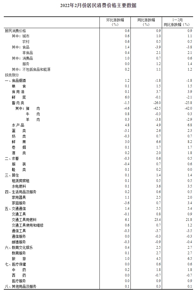 2022年2月份居民消費(fèi)價(jià)格主要數(shù)據(jù)
