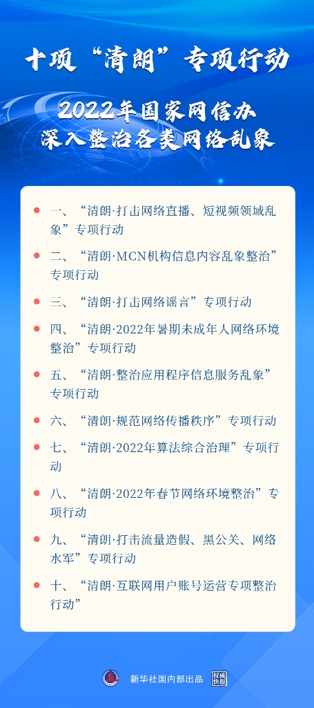 新華社北京3月17日電(記者王思北)記者17日從國新辦舉行的新聞發(fā)布會獲悉,2022年“清朗”系列專項行動將重點(diǎn)開展打擊網(wǎng)絡(luò)謠言,打擊網(wǎng)絡(luò)直播、短視頻領(lǐng)域亂象,算法綜合治理,暑期未成年人網(wǎng)絡(luò)環(huán)境整治等十方面任務(wù)?! ?/p>