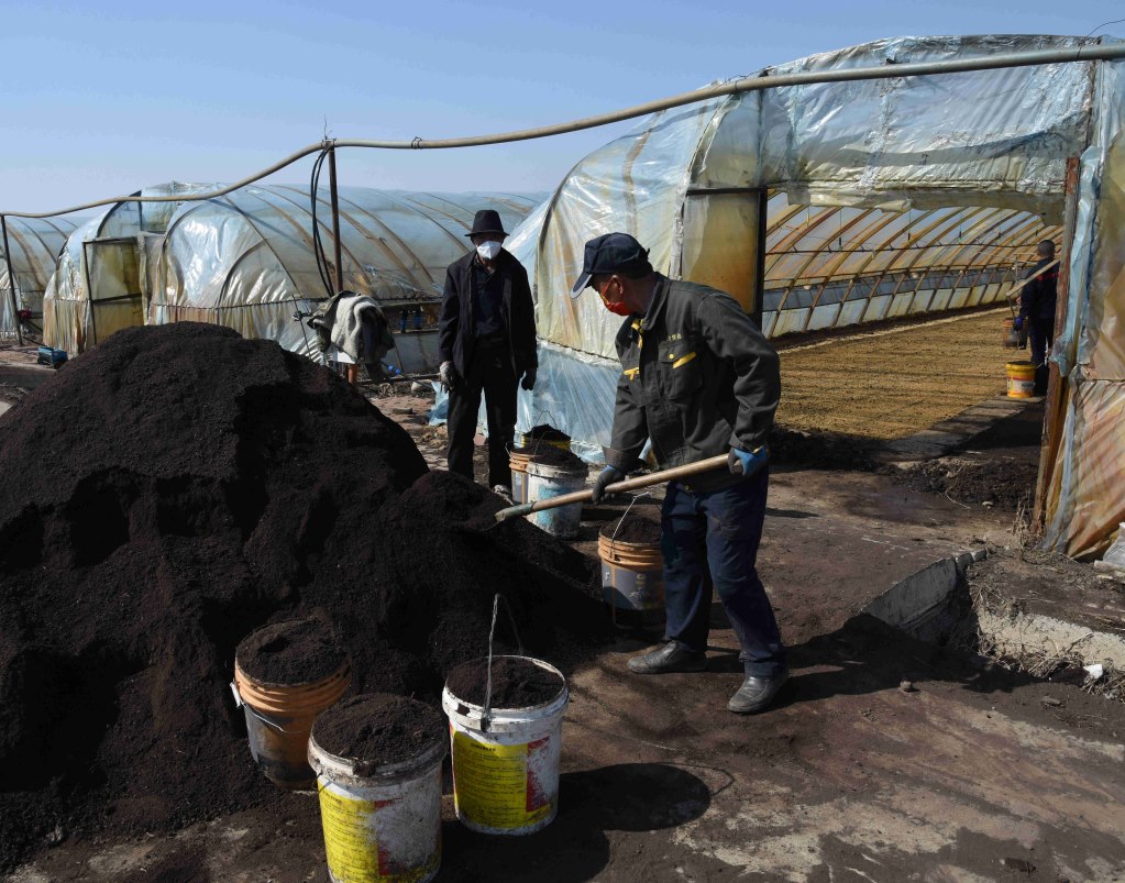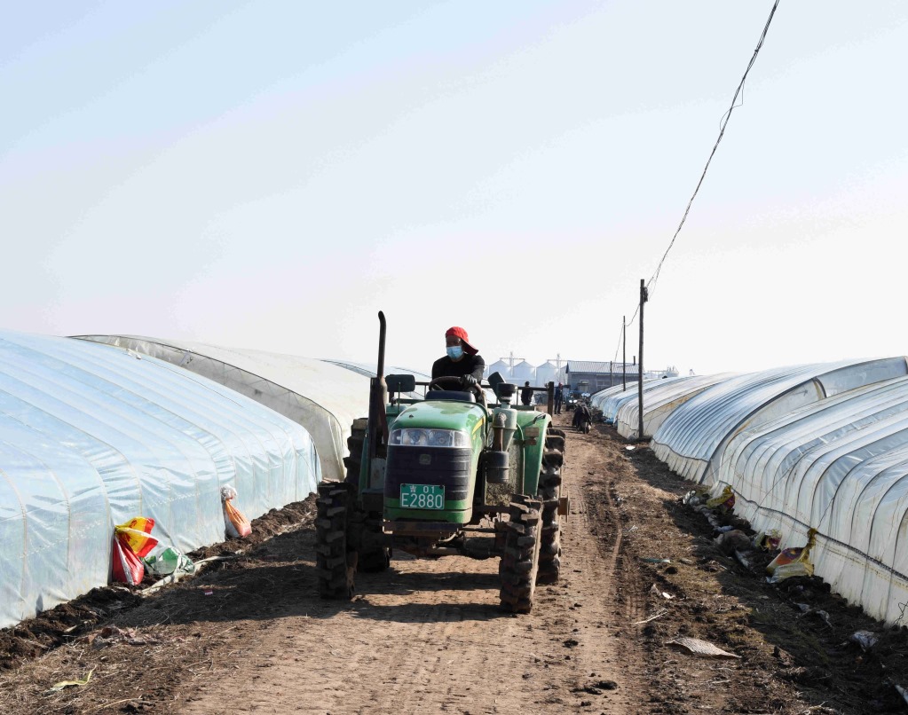 4月2日,在五常市友好村烏拉巴街屯,村民正在將土運進(jìn)大棚。新華社記者梁書斌攝