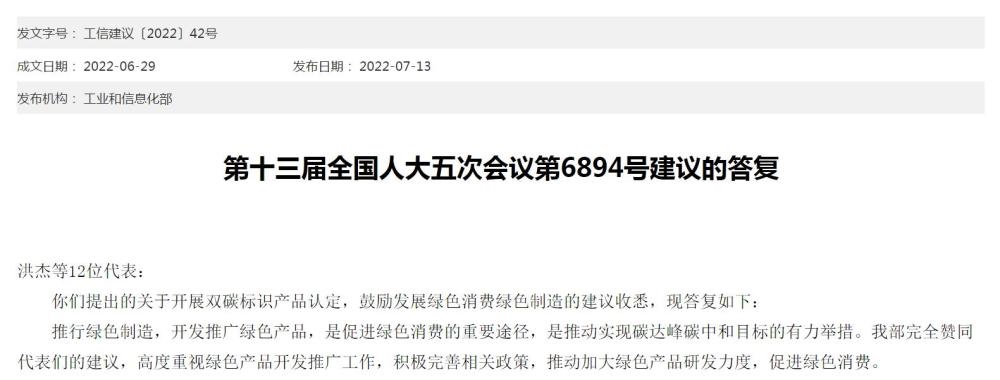 在答復中,工信部表示,推行綠色制造,開發(fā)推廣綠色產(chǎn)品,是促進綠色消費的重要途徑,是推動實現(xiàn)碳達峰碳中和目標的有力舉措。工信部完全贊同代表們的建議,高度重視綠色產(chǎn)品開發(fā)推廣工作,積極完善相關(guān)政策,推動加大綠色產(chǎn)品研發(fā)力度,促進綠色消費。