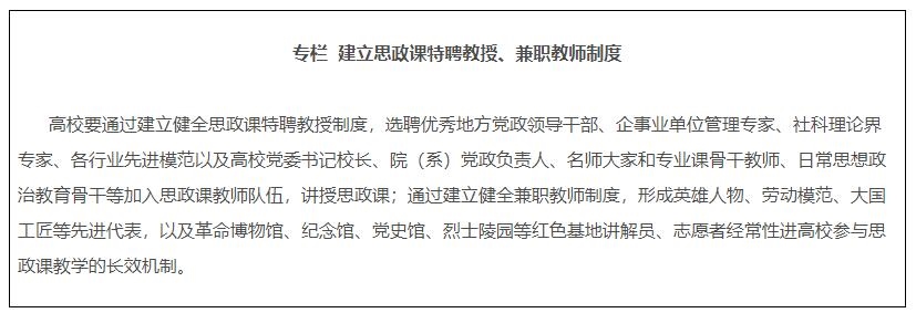 14.建設(shè)專兼結(jié)合的師資隊(duì)伍。各地各校嚴(yán)格按照要求配備建強(qiáng)高校專職思政課教師、輔導(dǎo)員隊(duì)伍,提高中小學(xué)專職思政課教師比例,實(shí)行思政課特聘教授、兼職教師制度,積極聘請(qǐng)黨政領(lǐng)導(dǎo)、科學(xué)家、老同志、先進(jìn)模范等擔(dān)任思政課兼職教師。深入實(shí)施馬克思主義學(xué)院院長(zhǎng)(書記)培養(yǎng)工程,通過(guò)集中培養(yǎng)培訓(xùn)、委托重大項(xiàng)目、加強(qiáng)實(shí)踐鍛煉、開展國(guó)際國(guó)內(nèi)訪學(xué)等方式,培養(yǎng)一批青年馬克思主義理論家。