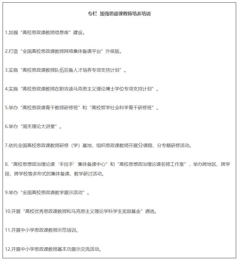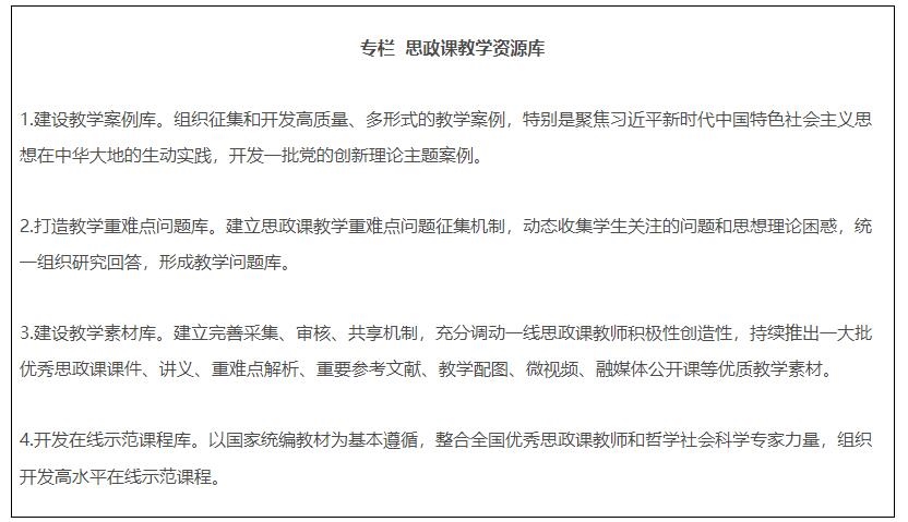 19.全面推進(jìn)課程思政高質(zhì)量建設(shè)。教育部組建高等學(xué)校課程思政教學(xué)指導(dǎo)委員會(huì),研制普通本科專業(yè)類課程思政教學(xué)指南,組織開展高校教師課程思政教學(xué)能力培訓(xùn),建設(shè)一批課程思政系列共享資源庫(kù)。建成一批課程思政示范高校,推出一批課程思政示范課程,選樹一批課程思政教學(xué)名師和團(tuán)隊(duì),建設(shè)一批高校課程思政教學(xué)研究示范中心。加強(qiáng)中小學(xué)學(xué)科德育建設(shè)。