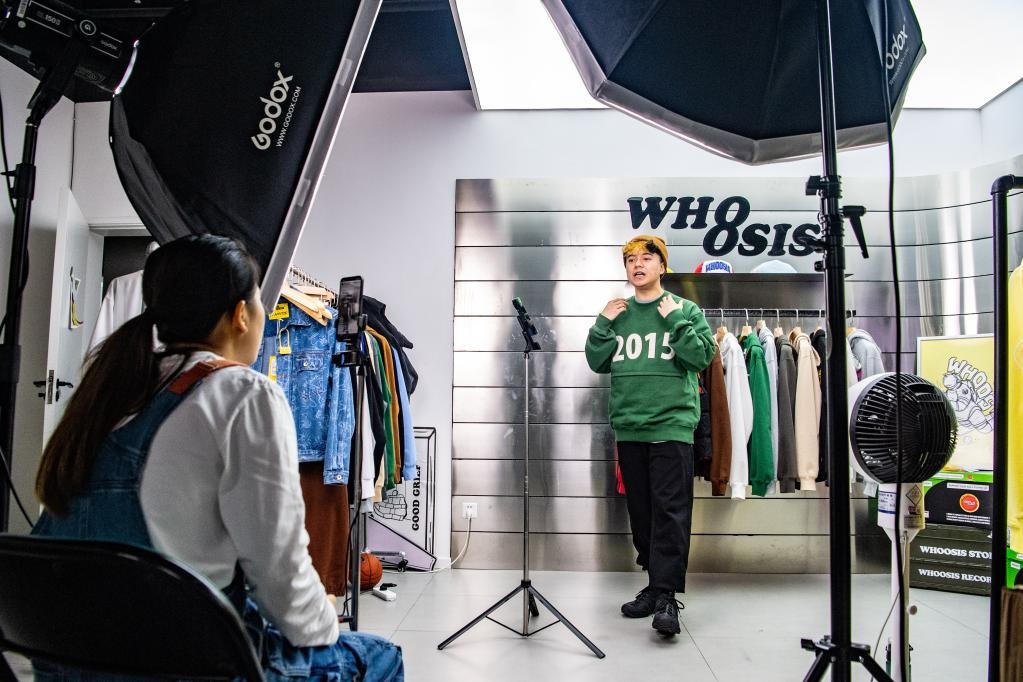 在重慶市渝中區(qū)由工業(yè)遺址改造成的“一廠影視園”一家國(guó)潮品牌公司內(nèi),創(chuàng)業(yè)者通過(guò)手機(jī)直播銷售商品(2022年9月27日攝)。新華社記者唐奕攝