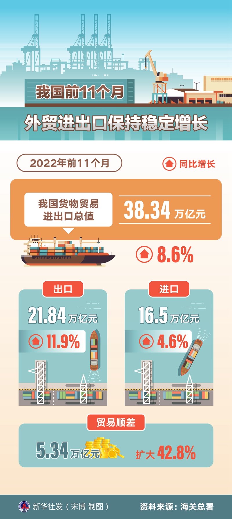 新華社北京12月7日電(記者鄒多為)海關(guān)總署7日發(fā)布數(shù)據(jù):今年前11個(gè)月,我國(guó)貨物貿(mào)易進(jìn)出口總值38.34萬億元,同比增長(zhǎng)8.6%。其中,出口21.84萬億元,增長(zhǎng)11.9%;進(jìn)口16.5萬億元,增長(zhǎng)4.6%;貿(mào)易順差5.34萬億元,擴(kuò)大42.8%。