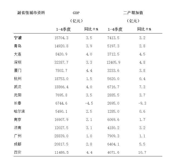 15座副省級(jí)城市中,經(jīng)濟(jì)增速“破4”的有西安(4.4%)、廈門(4.4%)、武漢(4.0%)和大連(4.0%),長春增速告負(fù),為-4.5%。