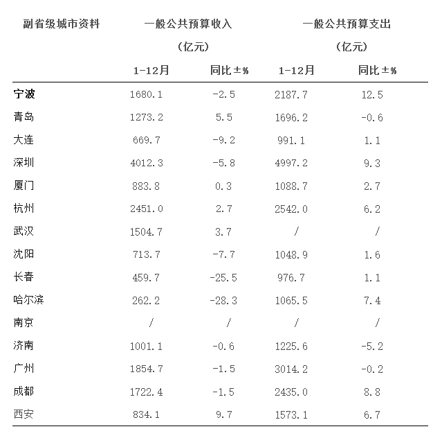 一般公共預(yù)算收入方面,除資料缺失的南京外,14座城市中有9座城市出現(xiàn)負(fù)增長,其中哈爾濱去年一般公共預(yù)算收入262.2億元,增速為-28.3%,一般公共預(yù)算支出1065.5億元,增速為7.4%。