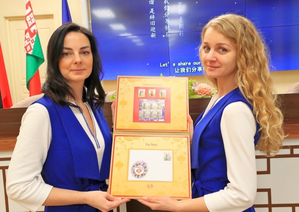 白俄羅斯國立大學孔子學院在明斯克舉辦《東方歷法:兔年》郵票和首日封發(fā)行儀式。工作人員展示白俄羅斯通信與信息化部發(fā)行的中國兔年郵票和首日封。