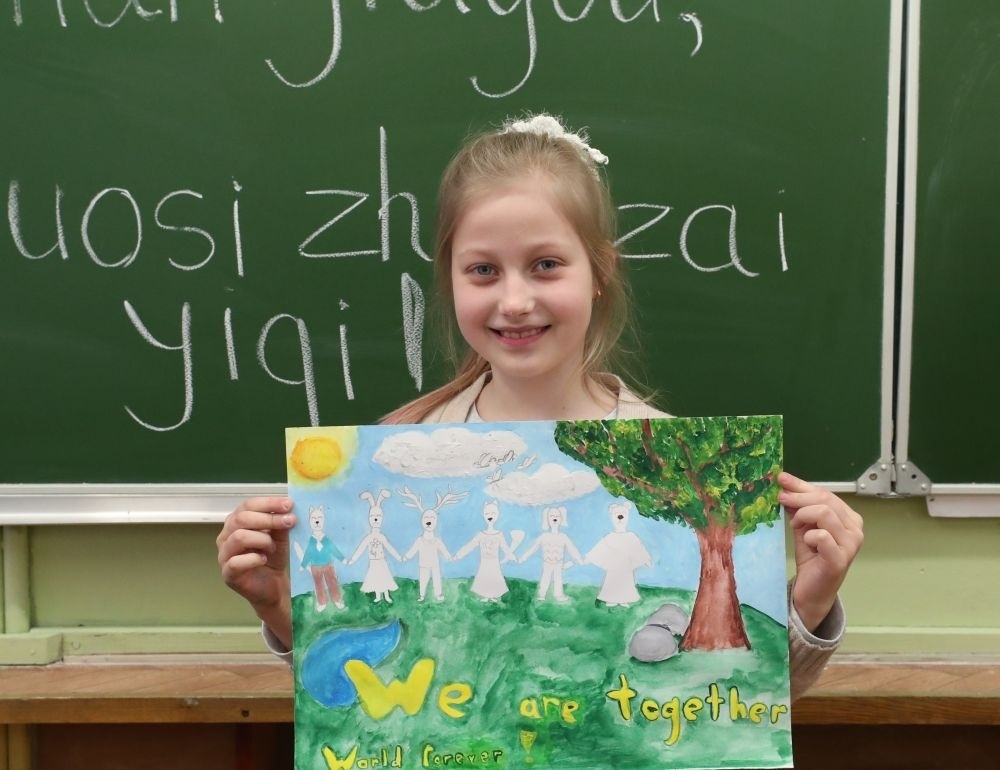 在白俄羅斯首都明斯克,一名小學生展示自己支持中國抗擊新冠肺炎疫情的繪畫作品。