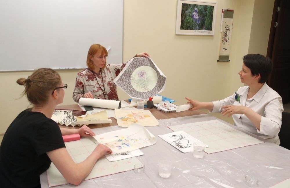 白俄羅斯藝術(shù)愛好者馬爾季涅夫斯卡婭(中)在明斯克的白俄羅斯國立大學孔子學院教授中國繪畫。