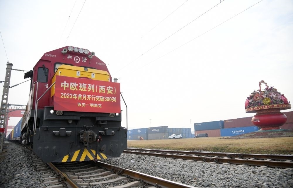 滿載日用百貨的X8151次中歐班列準備從西安國際港站開往白俄羅斯首都明斯克。