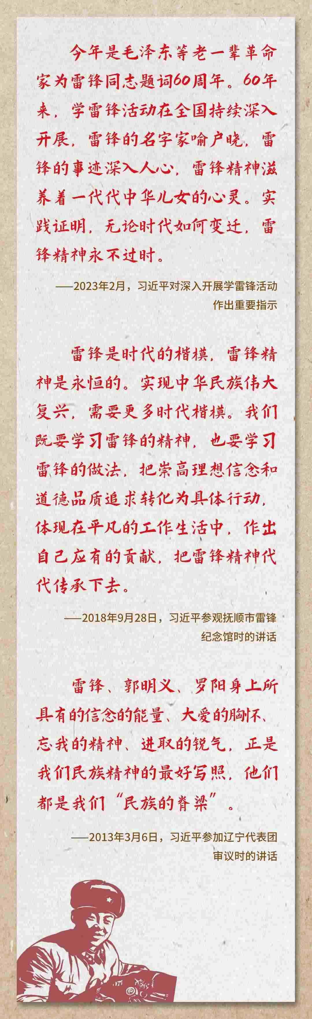 60年前的今天,毛澤東親筆題詞“向雷鋒同志學(xué)習(xí)”發(fā)布。劉少奇、周恩來、朱德、鄧小平等老一輩無產(chǎn)階級革命家也為雷鋒同志題詞。從此,全國掀起了學(xué)習(xí)雷鋒的熱潮,雷鋒精神傳遍神州。