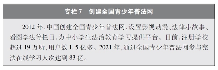 加強(qiáng)青少年網(wǎng)絡(luò)法治宣傳教育。青少年是祖國的未來、民族的希望。青少年網(wǎng)民在中國網(wǎng)民中的占比逐步增長。作為互聯(lián)網(wǎng)的“原住民”,青少年是網(wǎng)上學(xué)習(xí)、交流、生活最活躍的參與者、實踐者,其合法權(quán)益也更易受到網(wǎng)絡(luò)違法活動的侵害。中國從保護(hù)青少年網(wǎng)絡(luò)權(quán)益,促進(jìn)青少年健康成長、全面發(fā)展出發(fā),遵循青少年身心發(fā)展規(guī)律,貼近青少年學(xué)習(xí)生活實際,聚焦網(wǎng)絡(luò)沉迷、網(wǎng)絡(luò)欺凌、網(wǎng)絡(luò)淫穢色情信息等重點(diǎn)問題,通過普法微綜藝、兒童普法話劇、網(wǎng)絡(luò)普法故事廣播、網(wǎng)絡(luò)普法云課堂、學(xué)法用法知識競賽、法治副校長進(jìn)校園、編寫網(wǎng)絡(luò)普法讀本等生動活潑、豐富多彩的形式開展法治宣傳教育,逐步形成了政府、社會、學(xué)校、家庭相結(jié)合的法治宣傳教育格局,為提升青少年網(wǎng)民法治意識和網(wǎng)絡(luò)安全素養(yǎng)提供了全面保障。