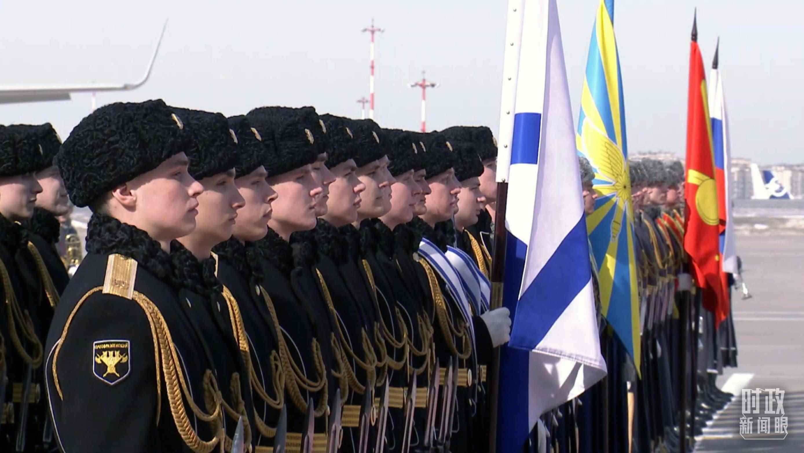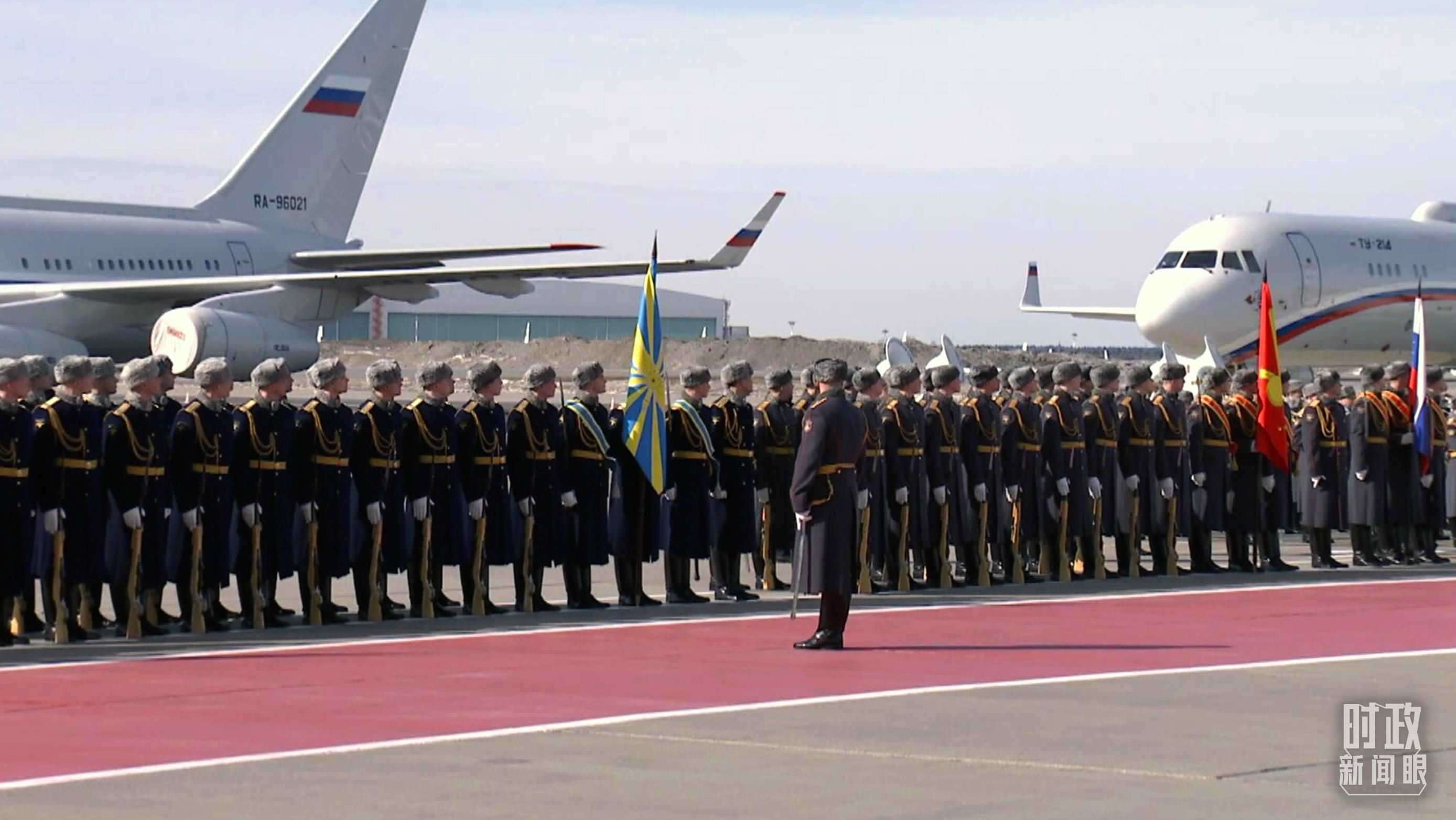 俄方在機(jī)場舉行隆重迎賓儀式。軍樂團(tuán)奏中俄兩國國歌。習(xí)主席檢閱俄羅斯三軍儀仗隊并觀看分列式。