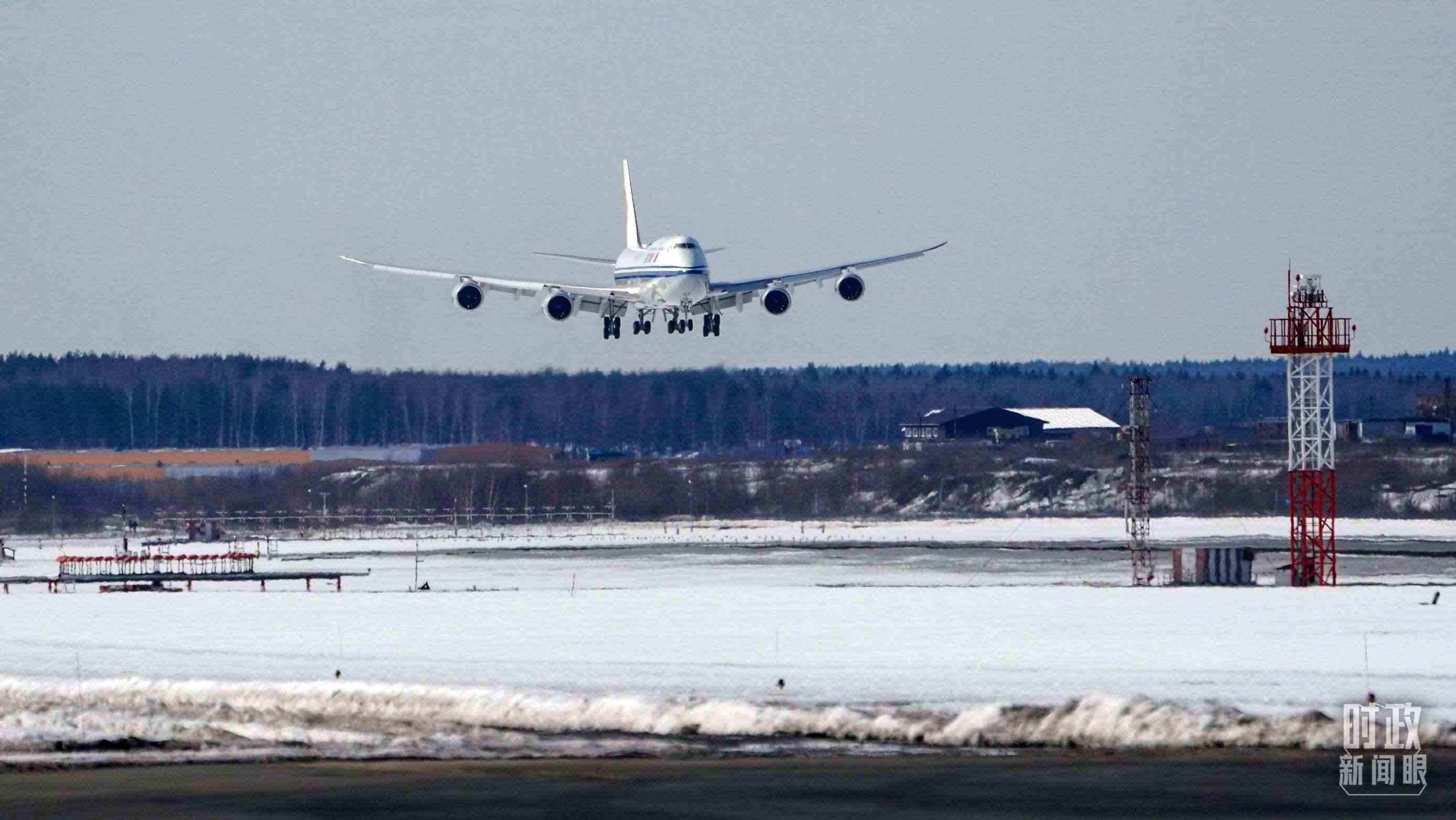 △習(xí)近平主席乘坐的專機(jī)即將落地莫斯科。(總臺國廣記者李晉拍攝)