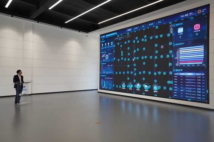 河北雄安新區(qū)中國(guó)電信智慧城市產(chǎn)業(yè)園的工作人員展示數(shù)字道路運(yùn)營(yíng)系統(tǒng)(3月24日攝)。