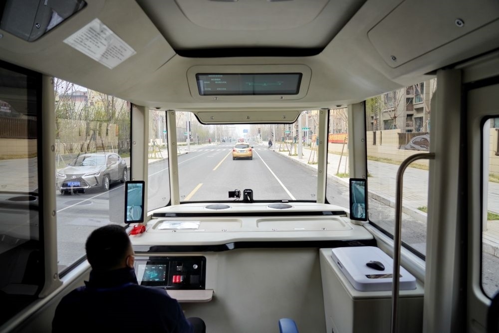 3月20日,智能網(wǎng)聯(lián)巴士901線測(cè)試車在河北雄安新區(qū)容東片區(qū)道路上行駛。