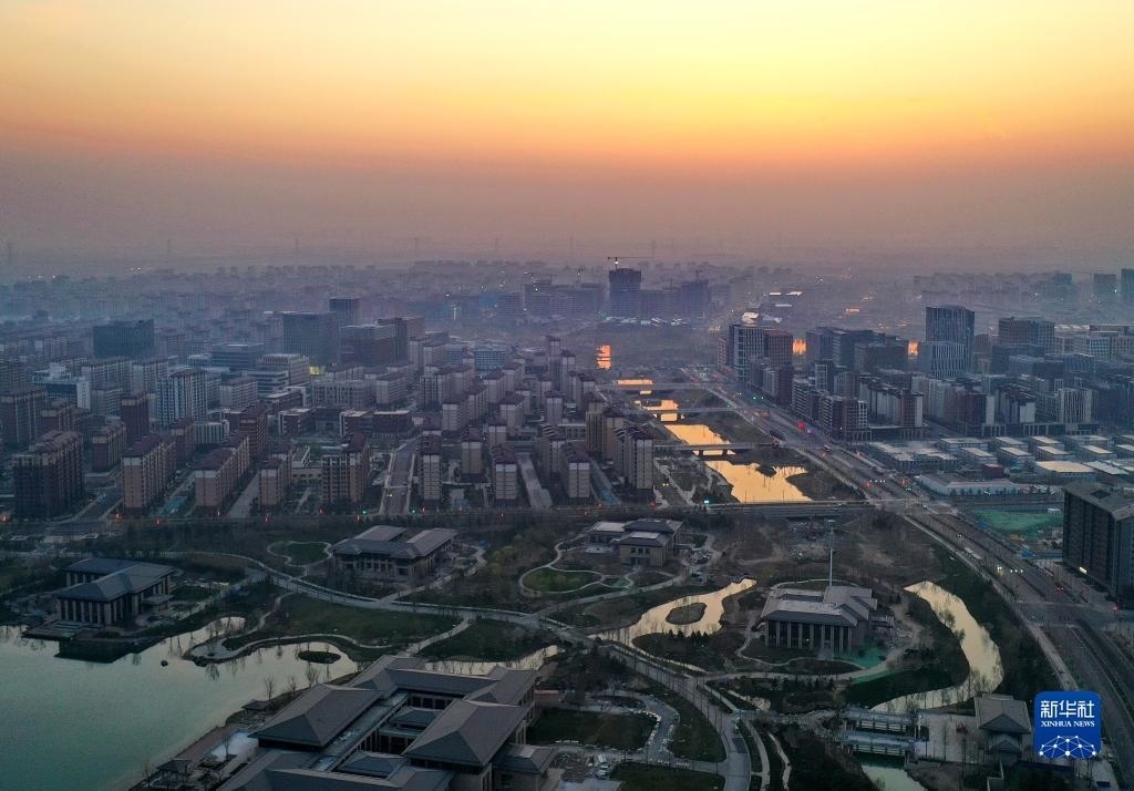 雄安新區(qū)容東片區(qū)內(nèi)的水系沐浴在晨光中(2023年3月31日攝,無人機照片)。新華社記者 牟宇 攝
