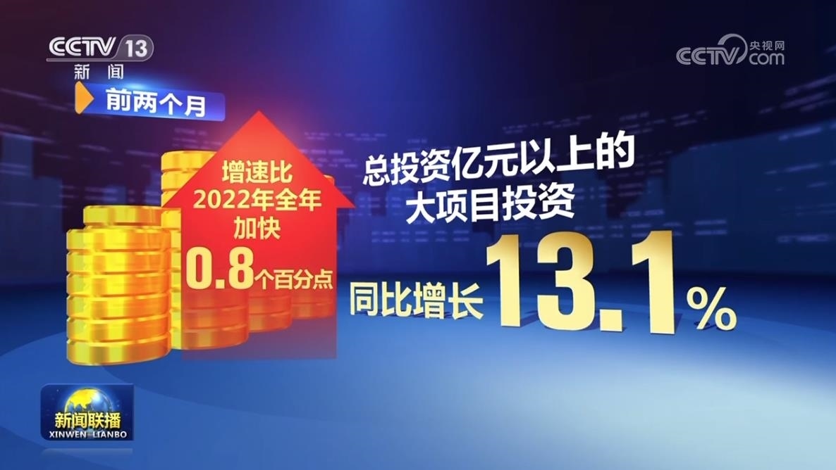 前兩個(gè)月,全國(guó)固定資產(chǎn)投資同比增長(zhǎng)5.5%,增速比2022年全年明顯加快,其中,總投資億元以上的大項(xiàng)目投資同比增長(zhǎng)13.1%,增速比2022年全年加快0.8個(gè)百分點(diǎn)。