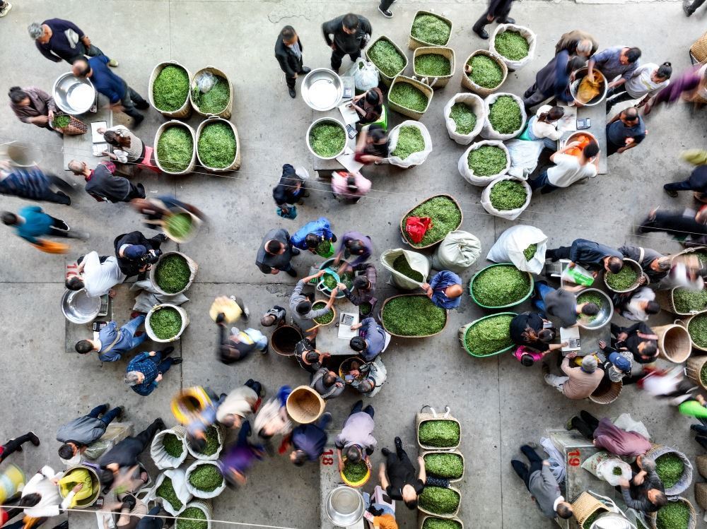 茶商在貴州省遵義市湄潭縣湄江茶青交易市場內(nèi)收購茶青(無人機(jī)照片,2023年4月4日攝)。新華社記者 歐東衢 攝