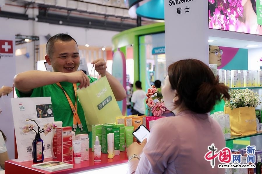 4月11日,工作人員為觀眾介紹瑞士護膚產(chǎn)品。中國網(wǎng)記者 吳亮 攝