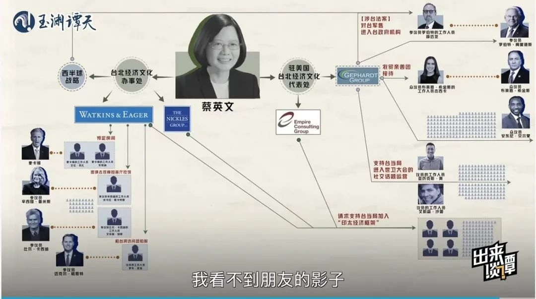 趁熱再打鐵,玉淵譚天繼續(xù)抽絲剝繭,以數據視頻《起底!臺當局“朋友圈”大公開》深扒臺當局近兩年在美國登記在冊的游說方式與對象,用翔實的數據,揭秘了臺當局能接觸到的美國會人員多為邊緣人的真相,結合送“保護費”、送“官職”等賣臺行為實錘,讓臺當局在所謂“美臺關系”中的卑微姿態(tài)展露無遺。