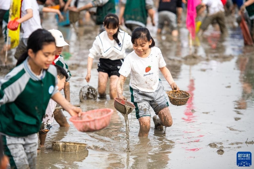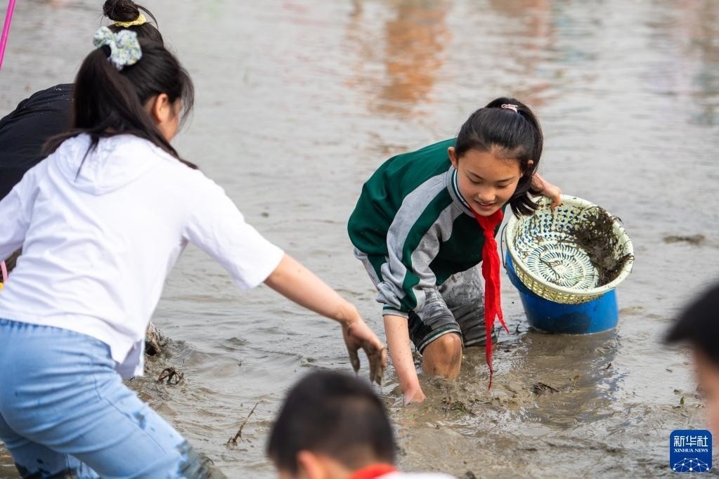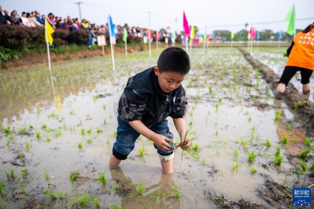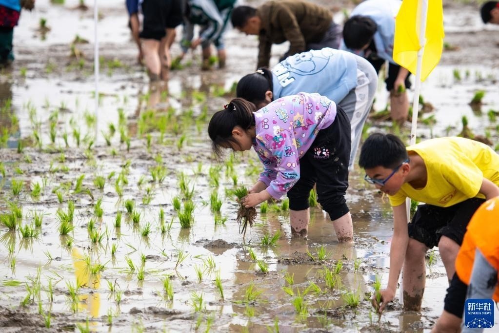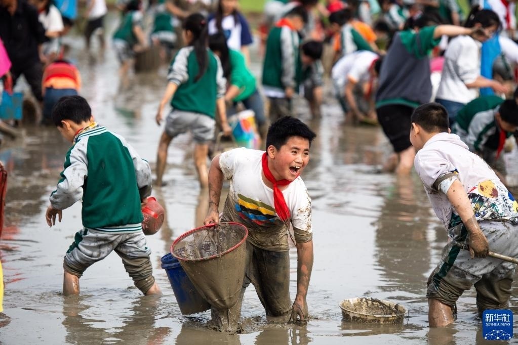 當(dāng)日,在湖南省長(zhǎng)沙市寧鄉(xiāng)市灰湯鎮(zhèn)花果山村舉行的農(nóng)耕民俗文化節(jié)學(xué)生研學(xué)活動(dòng)中,孩子們通過開展稻田插秧、捉泥鰍等“農(nóng)趣” 比賽,走進(jìn)田間地頭,感受勞動(dòng)帶來(lái)的艱辛與快樂。新華社記者 陳思汗 攝