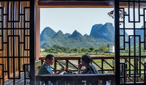 游客在廣西桂林市陽朔縣一家民宿喝茶聊天(2020年7月4日攝) 曹祎銘攝/本刊