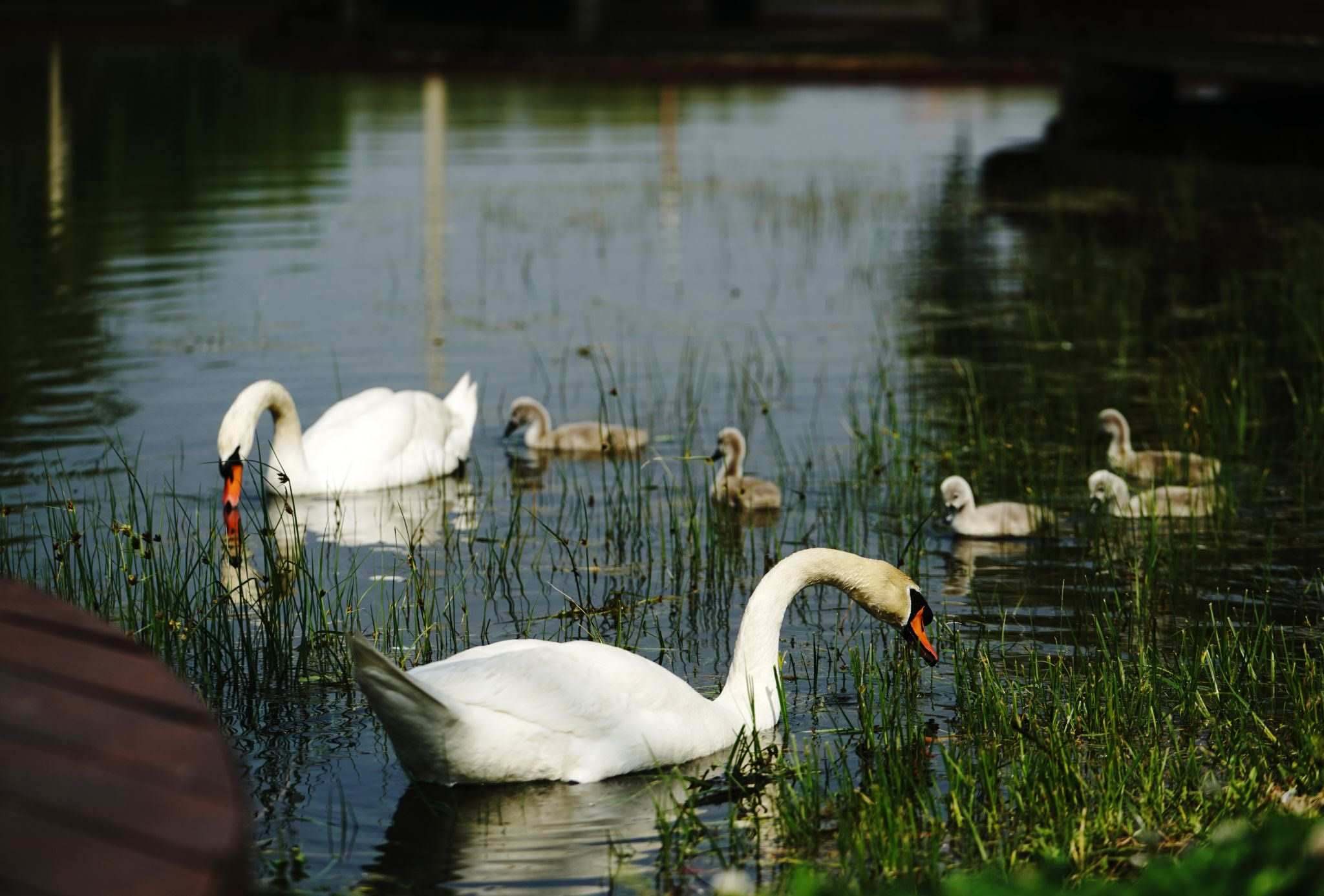 2023年4月26日,鄭州北龍湖濕地公園,天鵝“父母”帶領(lǐng)7只天鵝寶寶在湖中覓食嬉水。視覺中國(guó)