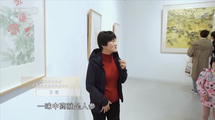 工筆花鳥(niǎo)畫家 上海市文史研究館館員 萬(wàn)芾:我們看看這幅,這幅應(yīng)該我們很熟悉的一味中藥材就是人參,看了中藥這么美麗的花,這么有生命力的現(xiàn)象,是不是我們吃的時(shí)候也不苦了。
