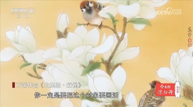 工筆花鳥(niǎo)畫家 上海市文史研究館館員 萬(wàn)芾:這個(gè)鳥(niǎo)我就覺(jué)得挺可愛(ài),它就是這樣的,童花頭,眼神是我自己擬人化的,因?yàn)轼B(niǎo)從一出生你來(lái)養(yǎng),她就把你當(dāng)媽媽了,我畫畫時(shí)就飛到我肩膀上,我們畫花鳥(niǎo)的畫家和畫人物畫家一樣的,你一定是要把這個(gè)對(duì)象要畫活。