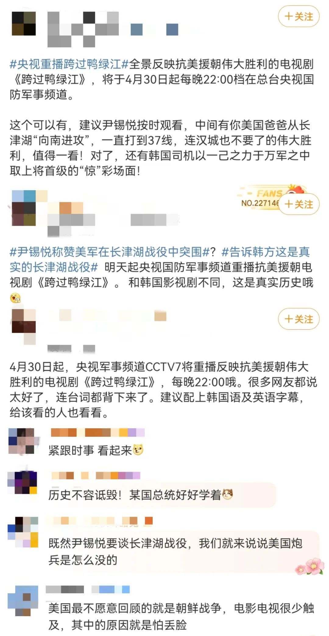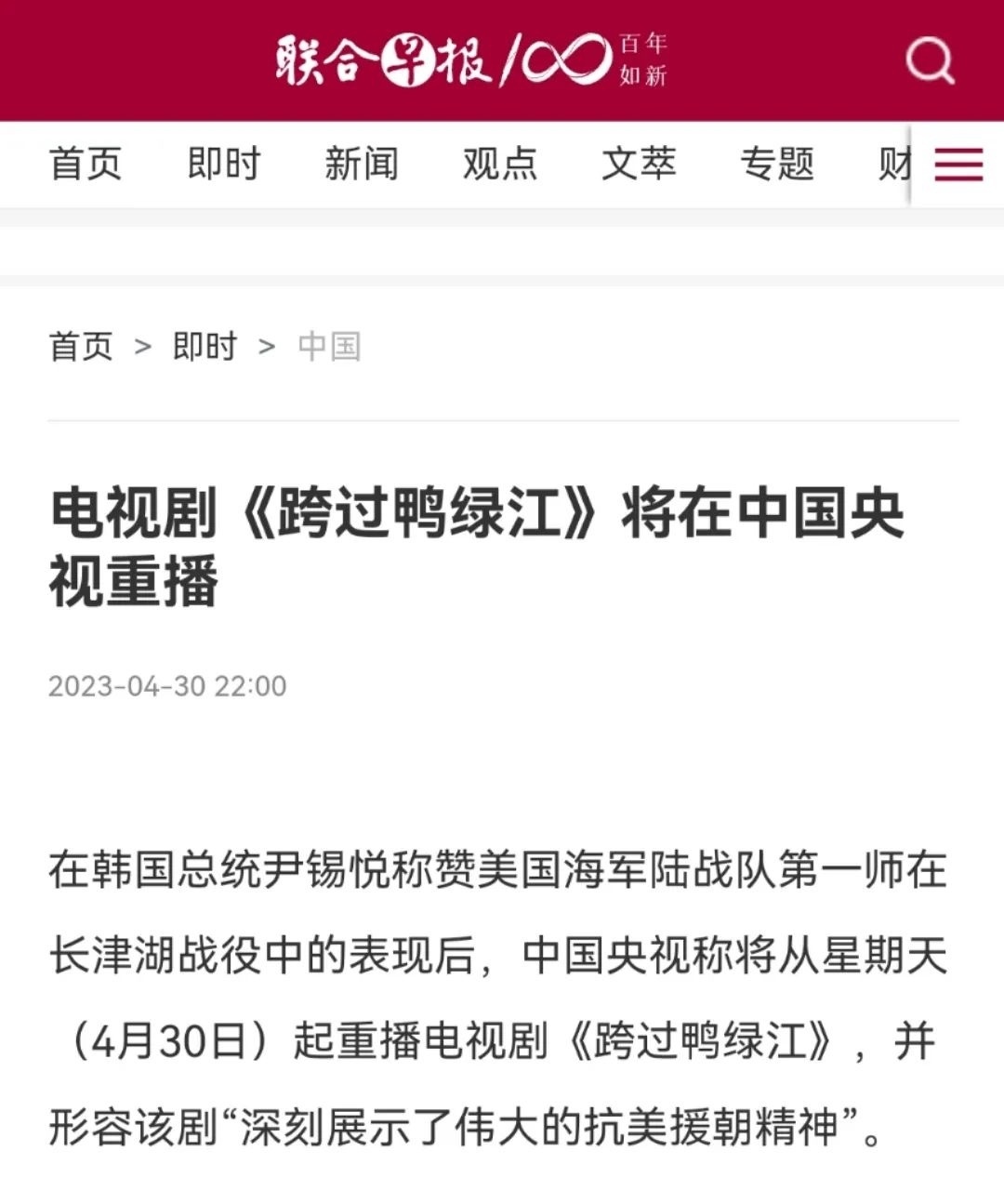 新加坡《聯(lián)合早報(bào)》更在4月30日晚10點(diǎn)準(zhǔn)時(shí)發(fā)布文章《電視劇<跨過(guò)鴨綠江>將在中國(guó)央視重播》,開篇明確重點(diǎn):在韓國(guó)總統(tǒng)稱贊美國(guó)海軍陸戰(zhàn)隊(duì)第一師在長(zhǎng)津湖戰(zhàn)役中的表現(xiàn)后,中國(guó)央視稱將從星期天(4月30日)起重播電視劇《跨過(guò)鴨綠江》。