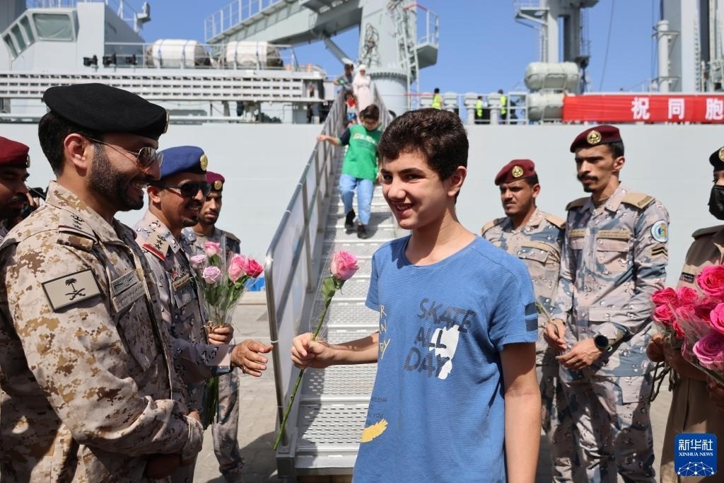 4月27日,從蘇丹撤離人員乘坐中國海軍軍艦抵達沙特阿拉伯吉達港。新華社記者 王海洲 攝