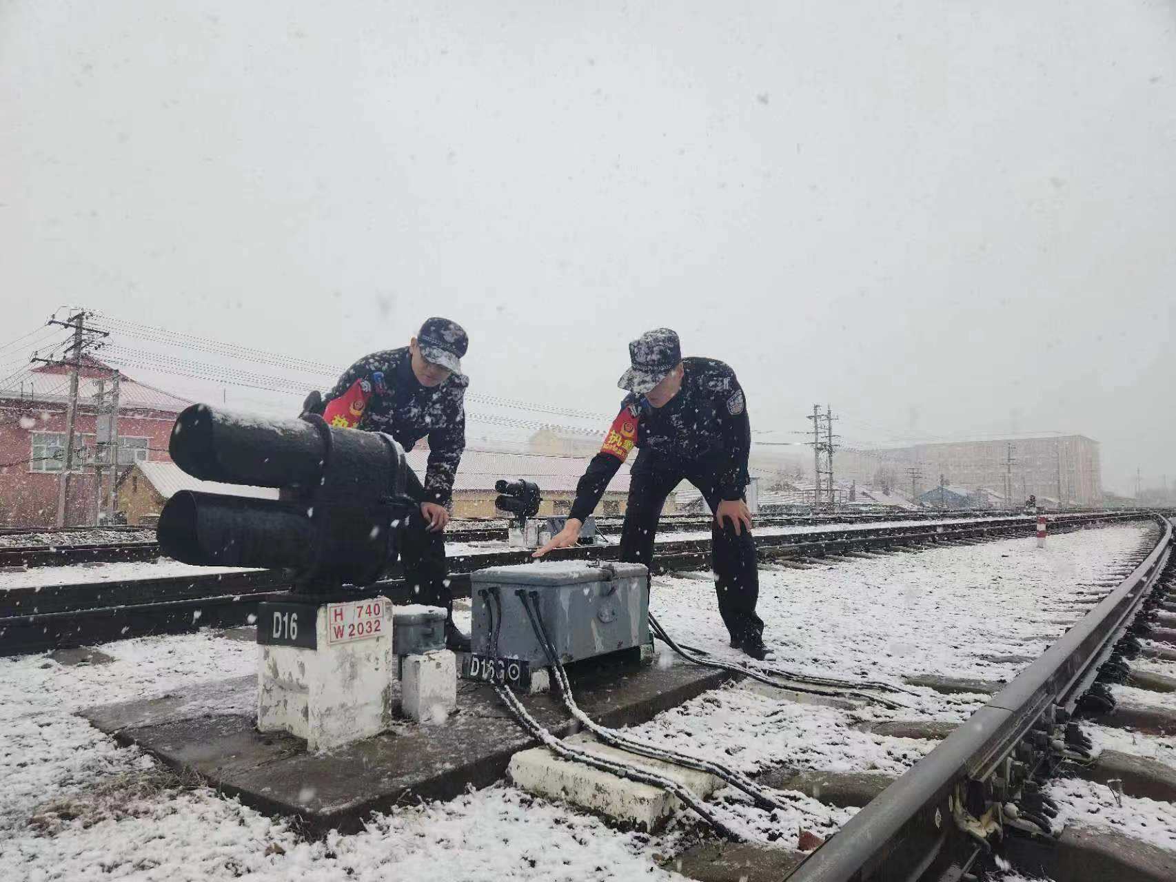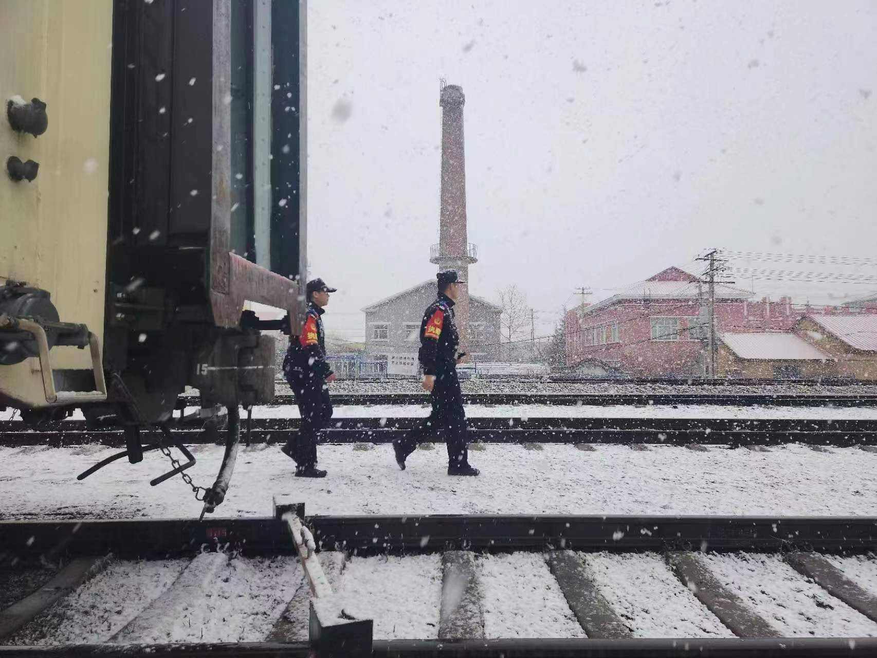 2023年4月30日,內(nèi)蒙古自治區(qū)根河市,海拉爾鐵路公安處根河站派出所民警在風(fēng)雪中巡邏。五一假期,位于大興安嶺深處的根河市迎來降雪天氣,根河站派出所民警在風(fēng)雪中堅守工作崗位,確保旅客出行安全。 張磊 攝