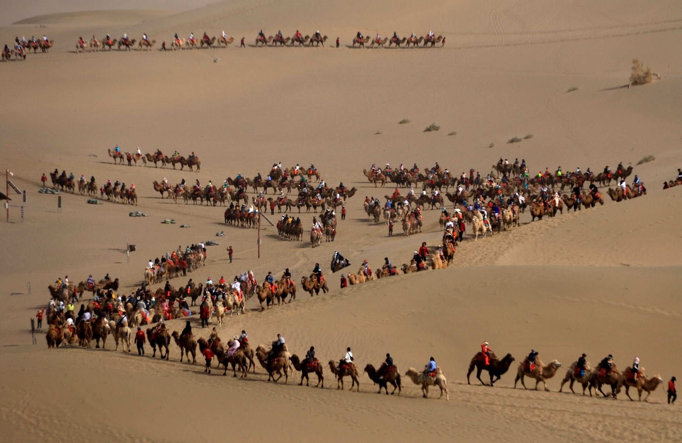 2023年5月1日,甘肅酒泉,敦煌市鳴沙山月牙泉景區(qū),“駱駝紅綠燈”亮起,農(nóng)戶牽著駱駝?dòng)行蛲ㄟ^。